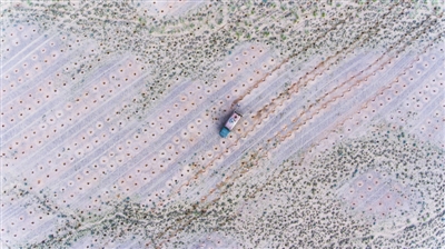 航拍工人们在潘金泽的草场为今年新栽种的梭梭树浇水。