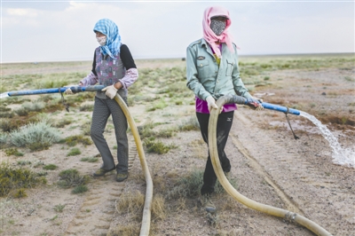 6月28日19时14分,年秀花(图右)和姐姐年秀芳给今年刚栽种的梭梭树浇当天的最后一车水。从3月11日离开甘肃老家,她们已经有近4个月没有回家了,她俩和其他几名工人一起栽种和养护了这里1700多亩梭梭树。