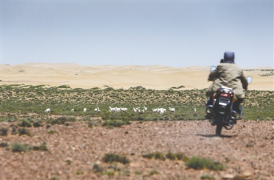 6月28日中午,内蒙古自治区阿拉善左旗通格图嘎查(嘎查即村子),在自家望不到边的草场里,侍生材倚靠在摩托车上清点星星点点的羊群。今年天旱少雨,牧草在阳光的暴晒下颜色愈发黯淡,羊群在安详地吃草,不远处起伏的黄色沙丘如同饥饿的猛兽正虎视眈眈。“我在这里住了40多年,我小的时候,沙子离我家还有1000米左右,到现在沙子已经朝我家走了500米。”侍生材对现状无可奈何。