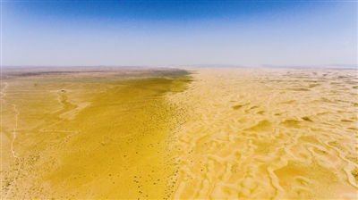 航拍侍生材家附近的草场与沙漠交界处。