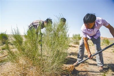 穷则思变。因为了解到老家甘肃有人在种梭梭树,并可以在梭梭树旁嫁接肉苁蓉,既防沙固沙,又能创收致富,苏海图的牧民们也开始了尝试。潘金泽对自己的首次尝试记忆深刻。他早在2001年就试种了30多亩,结果被秋天的一场洪水冲得一干二净,买树苗、拉围网,六七千元的投资打了水漂。2010年禁牧之后,又有人开始种,政府也开始对种梭梭树的牧民进行补贴。潘金泽这次尝试种了280亩,结果大获成功,到现在他已经种了近3000亩,而全村里已经有33万亩梭梭树林。曾经乡上的贫困村一跃成为富裕村。