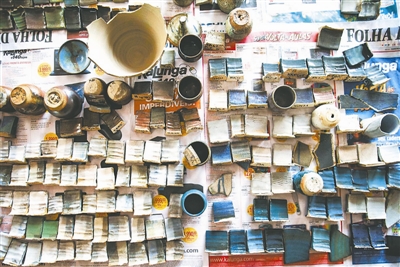 这是6月20日在巴西库尼亚拍摄的华人陶艺师阮蒙恩家中桌子上摆放的试验釉色陶块。出生在香港的阮蒙恩9岁就来到巴西,只会说几句简单的汉语。尽管如此,他在自己陶艺作品上的签名始终是汉字“阮”。他说,作为华人,他从小到大吃饭用的都是碗。与习惯用盘子的当地人不同,对碗的感情使他开始喜爱陶艺。直到现在,他制作最多的作品依然是各种碗。