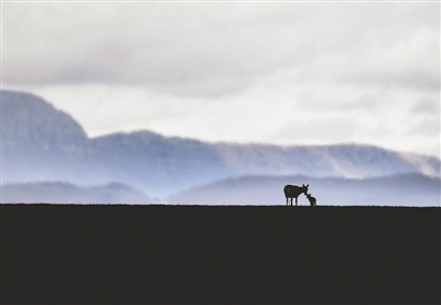 一只藏羚羊和它的孩子在一起(6月24日摄)。一年中,公羊和母羊的“团聚”只在交配季。这就意味着母羊要独自带大自己的孩子。