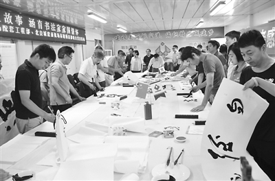 日前,“聆听建设者感人故事,涵育书法家家国情怀”联合党日活动在北京城建新机场市政工程建设工地举行。新机场建设者们的故事感动着前来参加活动的中国书法家协会的党员书法家,他们当场挥毫泼墨,为新机场建设者们创作书法作品,建筑工地飘起阵阵墨香。杨崇学摄