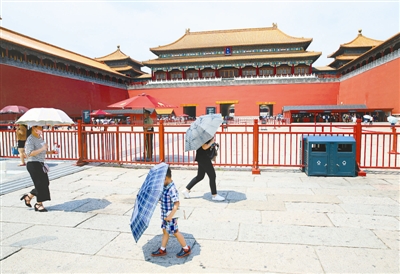 7月12日,游客顶着高温打伞在北京故宫游玩。当日是“入伏”第一天,全国多地遭遇高温天气。