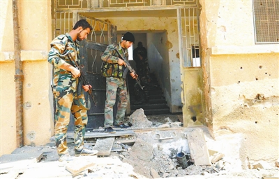 7月11日,在叙利亚南部苏韦达省艾斯费尔镇,叙政府军士兵查看一所曾被极端组织占领的学校。