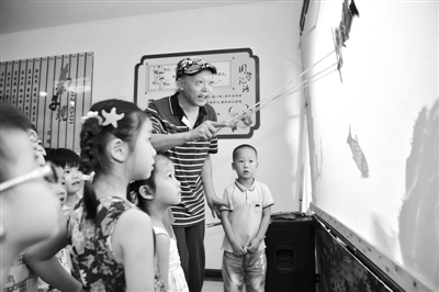 7月12日,皮影戏传承人马飞在科企社区百合堂活动中心向孩子们演示皮影戏的表演技巧。