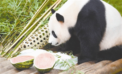 7月12日,在韩国京畿道龙仁市爱宝乐园,旅韩大熊猫“乐宝”享受消暑生日大餐。