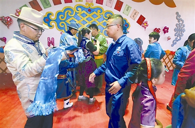 阿拉善左旗乌力吉蒙古族幼儿园向建设者敬献哈达。