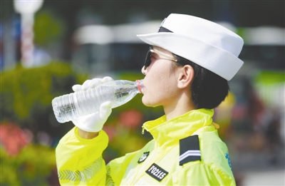 7月12日,河北省衡水市公安交警支队二大队一名女交警在执勤间隙喝水。