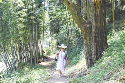 7月15日,一名游客走在大库村的林间小路上。