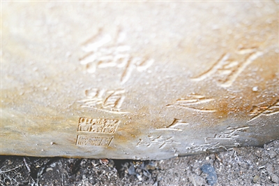 7月14日,记者在圆明园处了解到,目前圆明园正在进行史上最大规模考古发掘工作,此次挖掘自2013年开始至2020年结束。近日,考古人员在如园两段巨大石条上,发现了嘉庆皇帝的御笔题刻。 据史料记载,嘉庆皇帝经常坐船从水路而来,直接从延清堂北侧码头上岸,进入如园。图为嘉庆皇帝的御笔题刻。(肖媫妤)