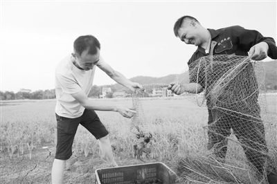 图为江西省吉水县八都镇种粮大户刘建平正在他的水稻田起网收小龙虾。