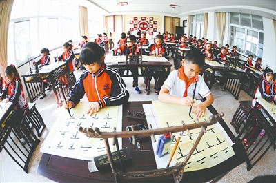 张家港塘市小学少年宫书画室,学生们在练字。 资料图片
