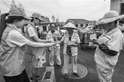 7月19日,志愿者把解暑的药品送给凤山街道垃圾中转站的工人。