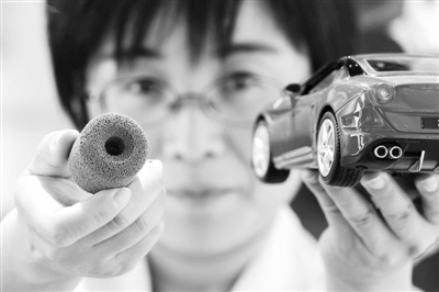 图为中科院专家展示凹凸棒石提炼的干燥过滤器,该产品目前在汽车领域运用广泛。