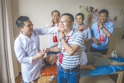 7月19日,职工健康管理服务中心,参加首批劳模休养的优秀工匠们在医师指导下体验康复治疗。