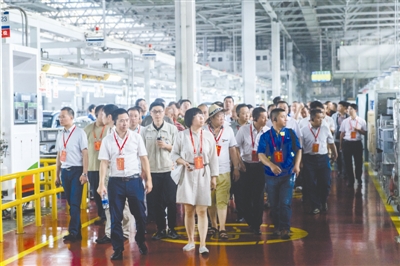 7月17日下午,劳模们来到北京现代汽车有限公司的生产车间参观。