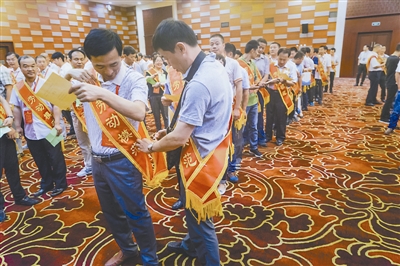 7月17日上午,参加集体合影前,来自安徽的全国劳模易斌为另一名劳模整理绶带。