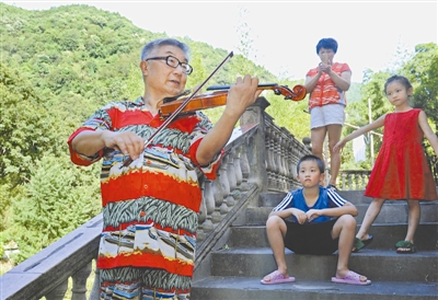 7月19日,在临安市白沙村留宿避暑的原浙江歌舞剧院小提琴手史崇义(左一)在练琴。