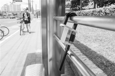 7月18日,上海,投放街头的共享雨伞遭遇“尴尬”。一把共享雨伞被人折断拆散,只剩伞柄孤零零悬挂原处。在海宁路附近一公交车站上,几天前有三把共享雨伞,当时还受到市民好奇围观和议论,过了不到4天,车站仅剩下一把伞柄。