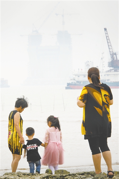 图③:大桥项目部附近的村民来到长江边,遥看远处的28号桥墩一天天“长高”。