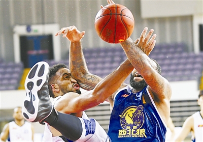 7月23日晚,北京奥体中心中心体育馆,NBL(全国男子篮球联赛)第十三轮北京东方雄鹿队以97比120负于陕西信达。图为双方外援正在拼抢。本报记者 许之丰 摄
