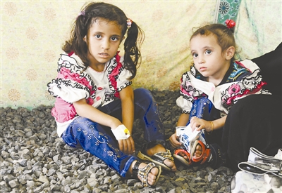 7月22日,在也门萨那,两名感染霍乱的女孩在医院等待接受治疗。