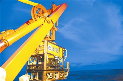 7月24日,吊车将“发现”号遥控无人潜水器吊出船舷外。