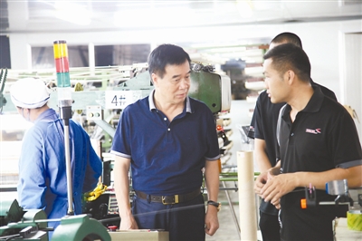 张国良(中)在研究碳纤维生产线。 肖婷婷 摄