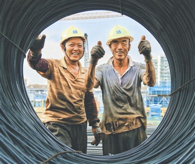近日,上海天气炎热,很多市民为了躲避骄阳都减少外出。在上海一建筑工地上,一些建筑工友们仍然在紧张作业。烈日将钢筋工的皮肤晒得黝黑发亮,汗水打湿了他们的衣衫。为了打造更好的人居环境,他们仍然乐观积极地奋战在建设第一线。