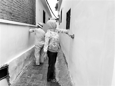 7月25日,在济南曲水亭街附近的老街巷里,4名来自德州的“粉刷匠”正在户外作业。今年50岁的大妈刘长珍告诉记者,他们平均年龄在50岁左右,负责芙蓉街老街巷墙面的粉刷作业,每人每天平均工作9个小时,即使是盛夏高温天,也要全副武装进行粉刷。