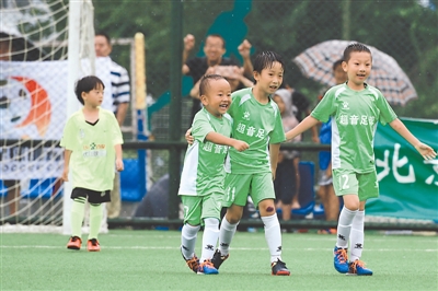 7月26日,小选手在“百队杯”6岁混合组冠亚军决赛中庆祝进球。