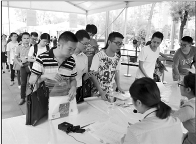 7月26日,成都天府新区政务服务中心外,准备申请落户的大学毕业生排起长队。《成都实施人才优先发展战略行动计划》7月20日出台后,吸引了来自各地的人才和大学毕业生,成都天府新区等一些政务服务中心申请、等待办理落户手续的民众排起了长队。