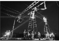 7月25日晚,施工人员正在武九客专庐山客专场加紧对电气化接触网进行克缺调整。