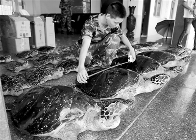 7月27日,广西防城港市公安边防支队向媒体通报:近日,经有关部门鉴定,该支队横江边境检查站日前查获的38只疑为国家二级保护动物玳瑁,单个案值从2000元至3万元不等。图为6月30日,官兵在测量玳瑁标本。廖键/东方IC