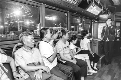 7月25日,游客乘坐“铛铛车”夜游北京,车上讲解员为游客介绍沿途景点。