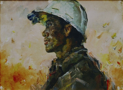 金忠敏多年来潜心油画创作,诗人、劳模等各类人物肖像、主题创作、风景巨制无不涉猎,他的艺术生命,如同超长且强烈的信号波不断释放出充满光彩的能量。肖像人物画最体现造型艺术的综合素养,扎实的素描造型功底,对光感色彩的敏锐观察和人物个性的准确捕捉,两相契合成就了金忠敏人物肖像画的意象特征。何为意象?即以造型色彩写其形,更窥其心灵神气。他创作的人物肖像之所以生动传神、充满活力,正是把握了描绘对象的精、气、神,既注重造形和布局,更着意刻画人物内在心境,以表衬里,写意抒神。意象表述如《老人与海——诗人曾卓肖像》,以准确的造形刻写出诗人含蓄深邃的神情,笔触细腻且色彩稳重又内含变化;同是肖像画《光明行——矿工肖像》,造形同样严谨,但神态刻画却与诗人迥然,少了含蓄,多了棱角,这正是画家追求作品个性差异的意象表述,外写形内书心才是艺中上品;《铸魂》、《大山放歌》明显地笔触泼辣,恣意抒发,虽挥洒淋漓但造形严谨,笔色灵动但不呆板,用色大胆、对比强烈,仍不失整体和谐、基调统一;《夏天的回忆》、《晨曲》、《白衣天使》画家仍以准确的造形,辅以平缓的笔触,柔和的光色烘衬出作品的“情调”氛围,人物或动或静,都是抓取的瞬间精彩,亦可从有限平面伸延出更多音画诗意,温婉切题。如此厚功积发,主题创作自然也就水到渠成,能置众多人物,分层次于特定主题中,不仅需要画家有整体构图知进退,更需要驾驭大场面中人、物个性的穿插融合。主题创作中既需要整体色调的统一协调,又需提取局部人物的各个精彩。金忠敏有此功力,主题创作自然颇丰。无独有偶,画家的油画风景,也是取景壮阔,光色饱浸,堪称巨制。