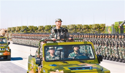 7月30日上午,庆祝中国人民解放军建军90周年阅兵在朱日和联合训练基地隆重举行。中共中央总书记、国家主席、中央军委主席习近平检阅部队并发表重要讲话。这是习近平乘车检阅部队。 新华社记者 李刚 摄