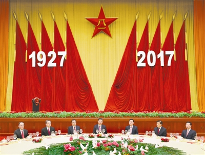 人民大会堂宴会厅灯火辉煌,洋溢着节日的喜庆气氛。主席台帷幕中央悬挂着巨型“八一”军徽,两旁是十面鲜艳的红旗。“1927-2017”几个醒目的大字,昭示着中国人民解放军走过了90年的光辉历程。18时许,在欢快的《迎宾曲》乐曲声中,习近平等党和国家领导人步入宴会大厅,同1800余名中外来宾欢聚一堂。