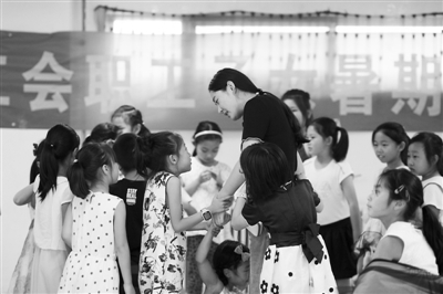 7月28日,位于北京市亦庄的一处工厂图书室里,30多个孩子在工厂工会工作人员和社工志愿者的带领下,一起做游戏、写作业、上兴趣课。孩子的父母绝大多数是非京籍职工。