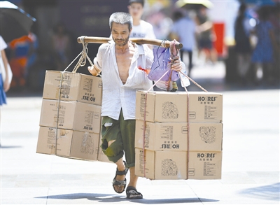 7月28日,一位搬运工在重庆市江北区观音桥商圈顶着烈日搬运货物。