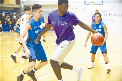 7月31日,美国NBA耐克星锐队球员博比·波尔蒂(中)与学生球员在比赛中。