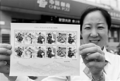 8月1日,河北省石家庄新乐市邮政工作人员展示《中国人民解放军建军九十周年》纪念邮票小版票。当日,中国邮政发行《中国人民解放军建军九十周年》纪念邮票一套6枚,小型张一枚。新华社发(贾敏杰 摄)