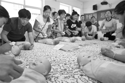 8月1日,在雄安新区安新县大王镇一所中学里,老师在给参加育婴员培训的学员讲解婴儿护理注意事项。