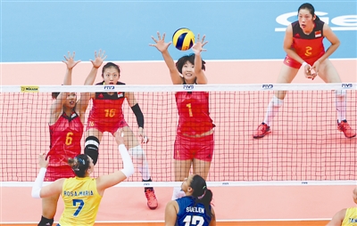 8月2日,在江苏省南京市举行的2017国际排联世界女排大奖赛总决赛小组赛的一场比赛中,中国队以3比0战胜巴西队。 新华社记者 杨磊 摄