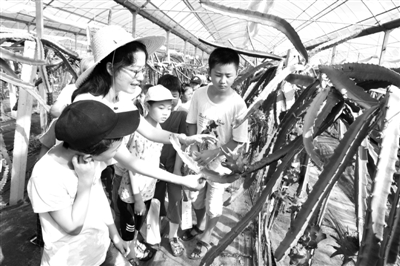 7月31日,浙江省建德市航头镇的留守儿童在当地一家农业园了解火龙果生长情况。
