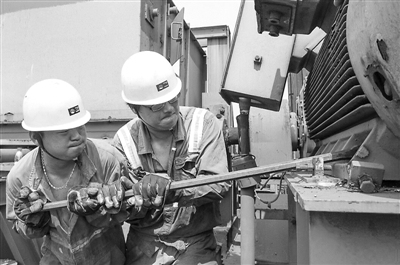 7月24日,宁波舟山港北仑矿石码头分公司机修分部现场修理班班员吴文洁(左)和技术员周苛在高温下抢修设备。当天,连接宁波钢铁有限公司输送皮带机的185千瓦驱动电机联轴器发生了故障,现场修理班立即启动应急预案,为钢厂生产保驾护航。