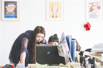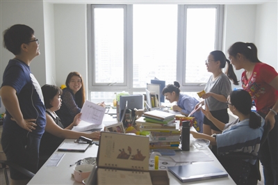 8月1日,机构的工作人员带着一名实习生在设计新学期的艺术课程教材。