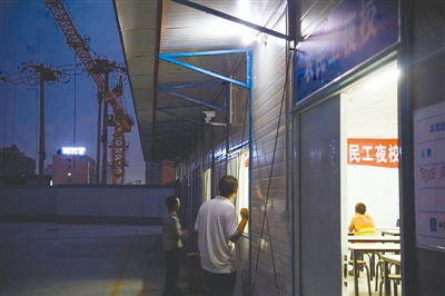 这是位于北京市朝阳区来广营B1医院项目工地上的农民工夜校。与多数工地不同,这个夜校设在生活区,旁边配备了一个小卖部,几米之外就是农民工宿舍和食堂。